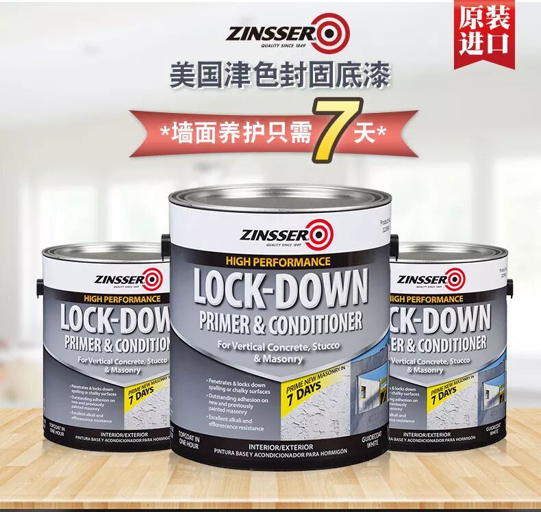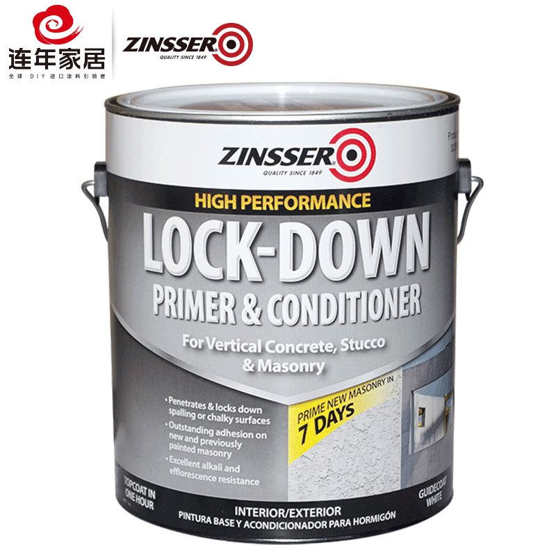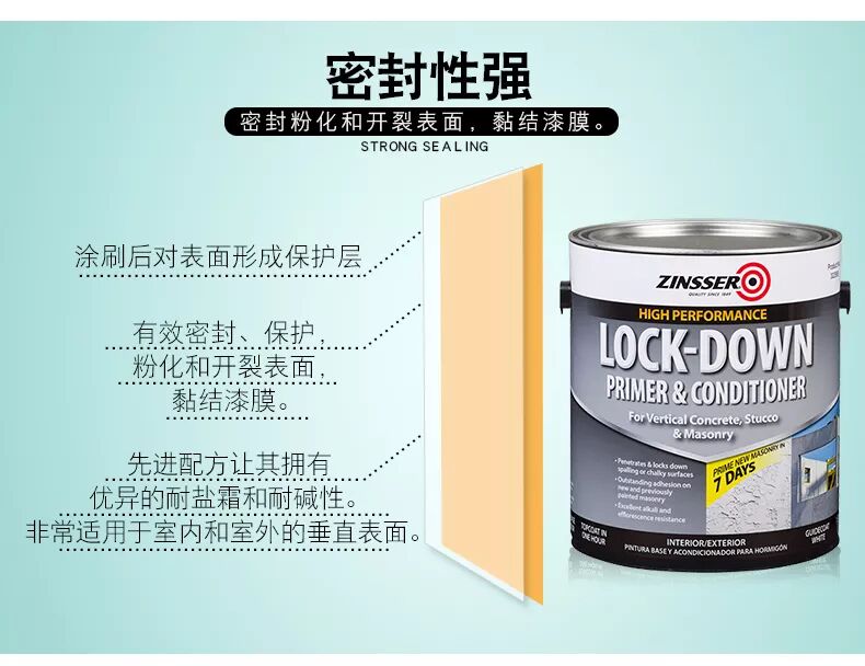 Zinsser津色封固底漆是一款高性能水性底漆兼调节剂。可渗透并密封垂直混凝土、砖石和灰泥表面。该产品拥有优异的附着力,可封固粉化和开裂表面,黏结漆膜。先进配方让其拥有优异的耐盐霜和耐碱性。非常适用于室内和室外的垂直表面。该产品可在1摄氏度的低温和高pH13值(环境下用于新浇混凝土和砖石(7天)表面。