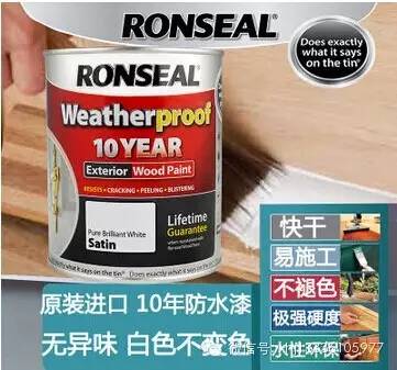 防风雨10年内外水性木器混漆采用先进的技术,提供持久的耐候保护您的所有内外部的木制品。 非常适合新的木制品或旧漆上,它具有极强防止木材的扩张、弯曲造成的任何开裂,剥落和起泡等。极佳的防水,耐化学腐蚀、抗紫外线确保10年不变色。涂刷只需要1个小时,就不因不断变化的天气条件而损坏了漆面。 它流平性极佳、没有流挂、没有刷痕,保持光泽度比传统有光泽油漆更长,无需油工都能刷出平滑均匀的漆面,超强的遮盖力只需要1-2遍(相当于白色油漆5-6遍)就可以全面保护你的内外部木材。