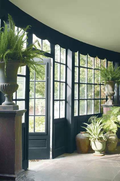 如果你喜欢更戏剧性的色彩包围,复古青石板绿色色调可以作为对比突出你喜欢大胆的颜色, 这里是用作天花板的颜色,如何拿起一些绿色的植物,以及在窗户外景观。