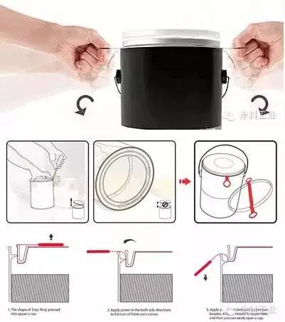 平时我们注意到一般的油漆桶盖子打开会很难,需要用螺丝刀撬开,如果没有使用完的话在盖上也会有空隙,这是一个创意的油漆桶设计,两边都有设置拉环,使用的时候只需要两边同时拉起就可以了。
