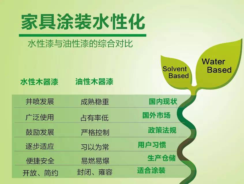 水性漆与油性漆是两个不同的产品,两者之间没有绝对的可比性,各有各的优势,下面对水性木器漆与油性木器漆的特点做详细说明,方便大家客观的认识水性木器漆与油性木器漆。