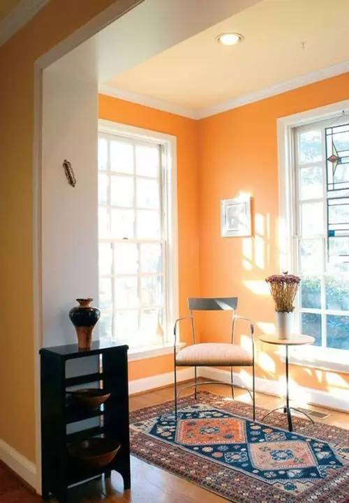 在颜色世界中,那些没有深度(阴影)的色彩反光度很强,它们像要朝你跳过来而不是将你拉近它所营造的空间氛围。比如你真正想要的是如奶昔一样有光泽流动感的橙色,但最后选择的颜色上墙后的效果却如硬梆梆的橙色交通椎,毫无光泽和层次感。因为色彩有三个维度:颜色、明度和饱和度。需要三者考虑其中才能出效果,而不是单纯的只想到某种颜色。