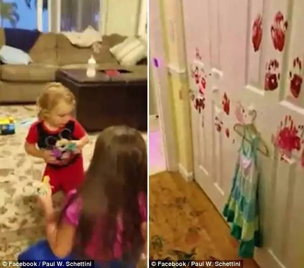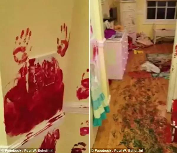 保罗接下来要做的就是要把房子、孩子还有狗都彻底清洗一遍。保罗说,“本来一切都风平浪静,孩子们一边玩,一边看着电影,我在厨房忙活。然后我的女儿就跑来问我,她们能不能去她的房间玩。7分钟之后,我打开门的那一刻,我发现整个房间里到处都是油漆。我儿子只穿着尿布走向我,身上被涂得花花绿绿,还在地上留下了一串脚印。”